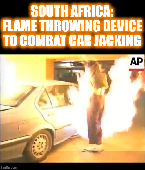NSFW Anon Archived FROM SOUTH AFRICA: FLAME THROWING DEVICE TO COMBAT CAR JACKING (or MURDEROUS RIOTERS) (i.imgflip.com)